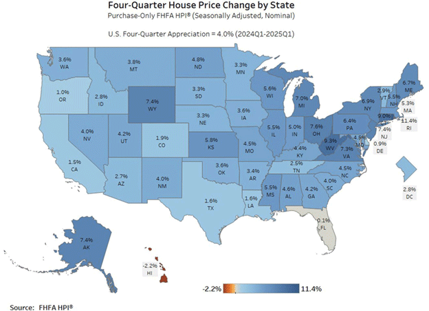 House prices appreciated 2.7% in Arizona between the first quarter of 2024 and the first quarter of 2025. This was below the national rate of 4.0% based on the U.S. Federal Housing Finance Agency (FHFA) quarterly House Price Index. Rhode Island topped all states for annual house price increases at 11.4%, followed by West Virginia at 9.3% and Connecticut at 9.0%. Only one state experienced a decline in house prices, Hawaii at -2.2%. The state and national house price changes are based on a purchase-only index. House prices for Arizona metropolitan areas are available on an all-transactions basis, using sales prices and appraisal data. The one-year change in prices was 4.6% in Lake Havasu City-Kingman, 4.1% in Tucson, 3.8% in Flagstaff, 2.7% in Sierra Vista-Douglas, 2.0% in Phoenix, 1.7% in Prescott Valley-Prescott, and 0.9% in Yuma. For comparison, the year-over-year all-transaction index change for Arizona and the U.S. in the first quarter of 2025 was 2.7% and 4.7%, respectively. -Valorie Rice