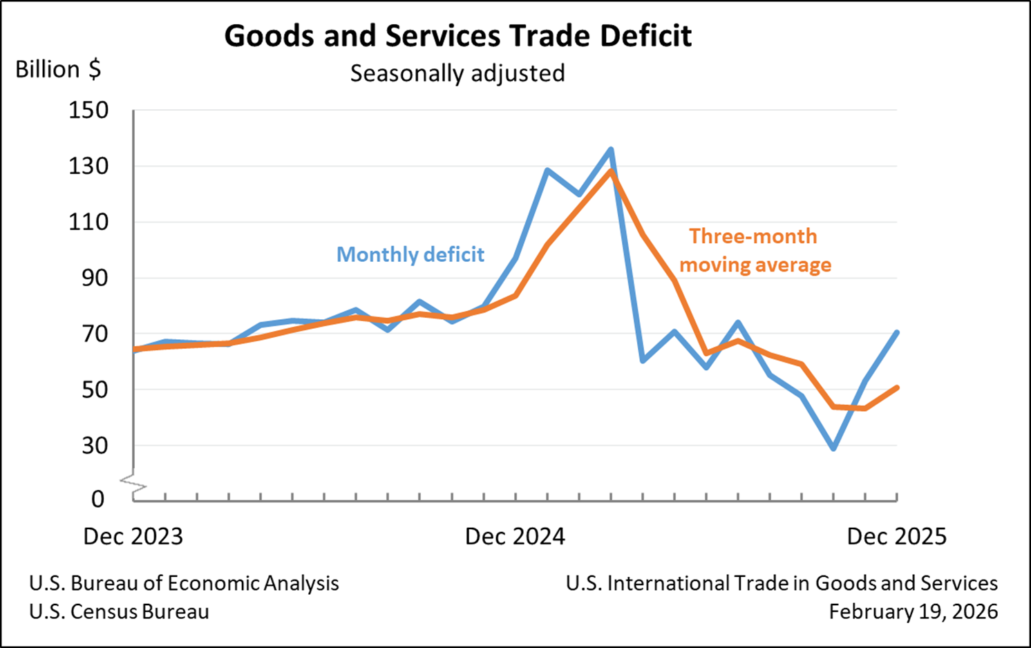 The December goods and services trade deficit came in at $70.3 billion, up $17.3 billion from a revised $53.0 billion in November. December exports fell $5.0 billion to $287.3 billion, and imports rose $12.3 billion to $357.6 billion. The increase in the deficit reflects an increase in the goods deficit of $15.7 billion to $99.3 billion and a decrease in the services surplus of $1.6 billion to $29.0 billion. For 2025, the goods and services deficit decreased $2.1 billion, or 0.2%, from 2024. Exports increased 6.2% to $199.8 billion, and imports increased 4.8% to $197.8 billion. The December figures show surpluses, in billions, with Netherlands ($5.6), South and Central America ($4.3), and United Kingdom ($3.7). The greatest deficits were with Taiwan ($19.8), Vietnam ($17.6), and Mexico ($14.5). -Delaney O’Kray-Murphy