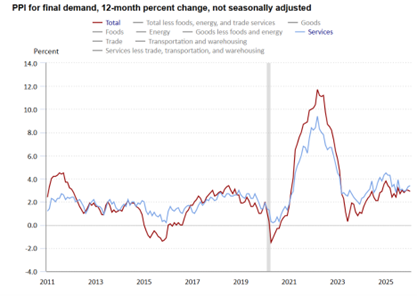 The U.S. Producer Price Index for final demand rose 0.5% over the month in January, its fastest pace since September 2025. Strong growth in January can be traced to final demand services, with strong gains in wholesale and retail margins. The index for final demand goods declined. The final demand index was up 3.4% over the year, slightly slower than the December 2025 reading of 3.5%. The index for processed goods for intermediate demand was unchanged over the month in January. The unprocessed goods for intermediate demand index moved down 0.5%. -George Hammond