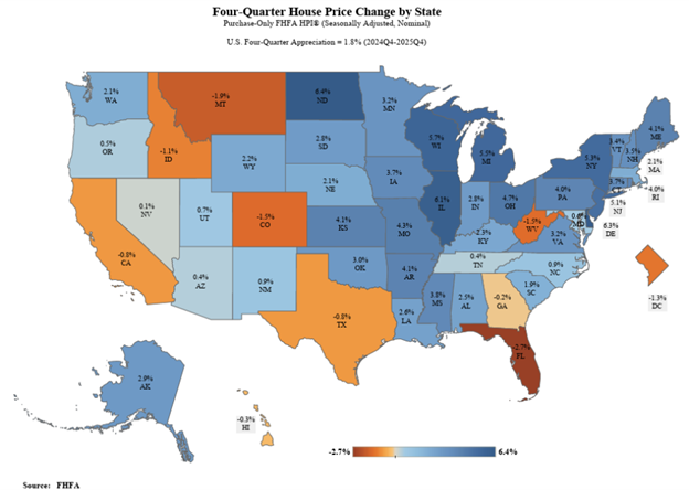 The U.S. Federal Housing Finance Agency (FHFA) reported U.S. house prices were up 1.8% over the year in the fourth quarter of 2025. Arizona had slight house price appreciation over the year, with a 0.4% increase in the fourth quarter of 2025. North Dakota led all states with a 6.4% increase, while ten states reported a decline in prices, Florida decreasing the most at -2.7% based on the purchase-only index. Most Arizona metropolitan areas reported annual gains in house prices for the fourth quarter of 2025, as reported with the all-transaction index (which includes sales prices and appraisal data). Lake Havasu City-Kingman reported no change in house prices over the year, while Yuma increased by 1.0%, Phoenix by 1.2%, Tucson by 2.2%, Sierra Vista-Douglas by 4.0%, Prescott Valley-Prescott by 4.7%, and Flagstaff by 5.7%. -Valorie Rice