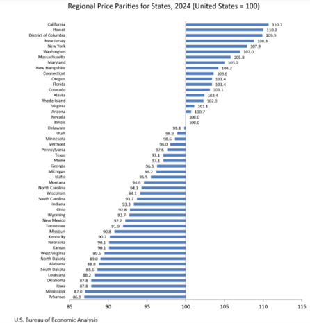 Real personal income increased in 46 states and the District of Columbia between 2023 and 2024, according to the U.S. Bureau of Economic Analysis (BEA). Arizona had a 3.3% increase in real personal income compared to 2.9% in the U.S. The changes in real personal income ranged from a decline of 2.2% in North Dakota to an increase of 5.5% in California. The release also included real personal consumption expenditures (PCE) by state, which are the current-dollar estimates adjusted by the corresponding regional price parity (RPP) and the national PCE price index. Arizona’s change in real PCE for 2024 was 4.0%. The current dollar PCE increased by 6.7% while its implicit regional price deflator increased 2.6%. Arizona’s regional price parity for all items placed near the national level, at 100.7 (where the nation equals 100). California had the highest RPP at 110.7, followed by Hawaii at 110.0, while on the other end of the spectrum, Arkansas had 86.9. All items cover all consumption goods and services, including housing rents, which are often the main driver. The RPP for housing in Arizona was 106.8, while it ranged from 54.2 in West Virginia to 154.3 in California. Regional price parities are still available for metropolitan areas, and most Arizona metropolitan areas report all item levels below the nation, with Sierra Vista-Douglas at 89.2, Yuma at 92.7, Lake Havasu City-Kingman at 94.1, Tucson at 96.9, Prescott Valley-Prescott at 98.3, Flagstaff at 100.3, and Phoenix at 103.3. -Valorie Rice